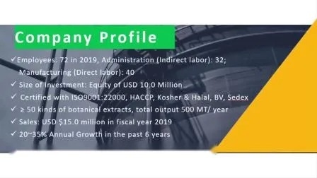 Hunan Sunfull Bio-tech Co., Ltd. est une entreprise de haute technologie avec plus de 20 ans d'expérience professionnelle en R&D, production et vente d'extraits de plantes naturelles. Notre société a obtenu diverses qualifications, notamment le prix national de deuxième niveau, le prix provincial de premier niveau, les certificats ISO9001, ISO22000/HACCP, KOSHER et HALAL. Sunfullbio, Sunepica™ et Teavital™ sont nos marques déposées bien connues.